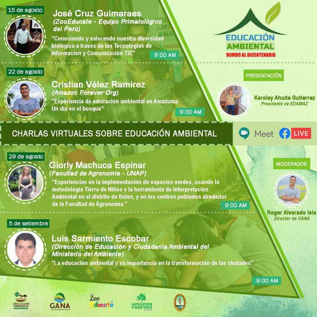 De manera exitosa finalizó las charlas virtuales sobre Educación Ambiental denominada «Educación Ambiental rumbo al Bicentenario», actividad organizada por Educación Ambiental Amazónica, programa adscrito al Grupo Ambientalista Nueva Amazonía – GANA.